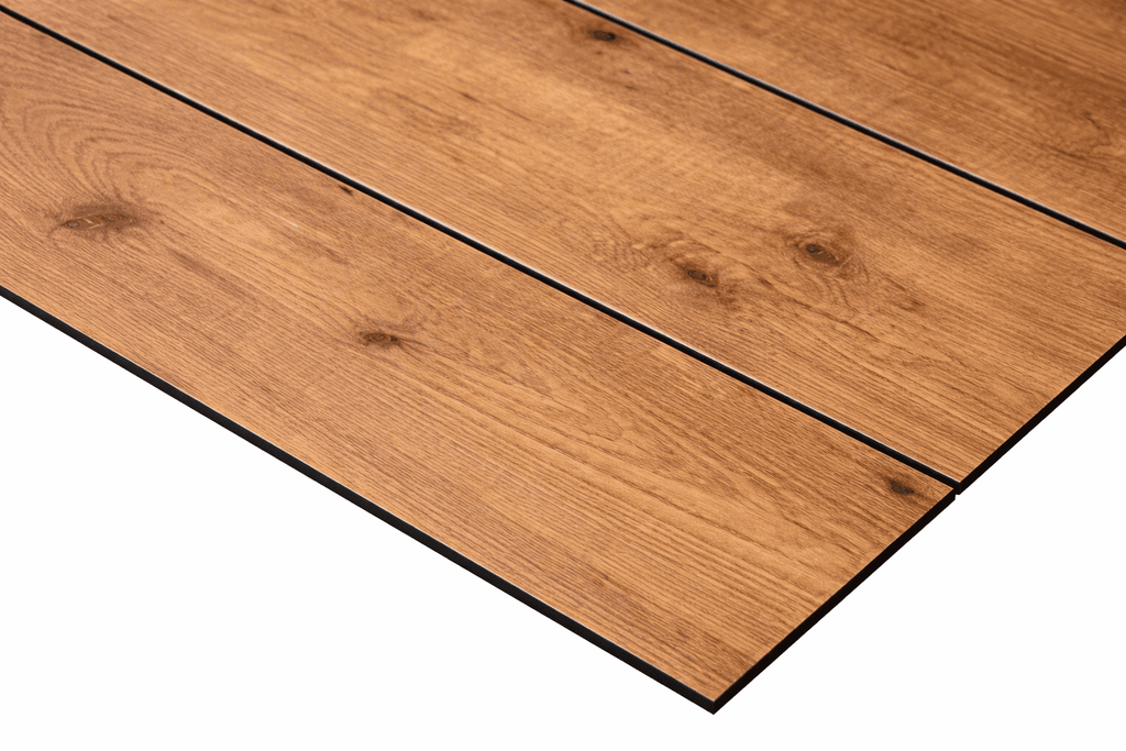 Made from durable Compact Laminate specifically designed for exterior areas, its outstanding resilience and sophisticated style open up even more outdoor design possibilities. Its distinctive black core not only eliminates the need for edge treatment but also serves as a striking design feature.